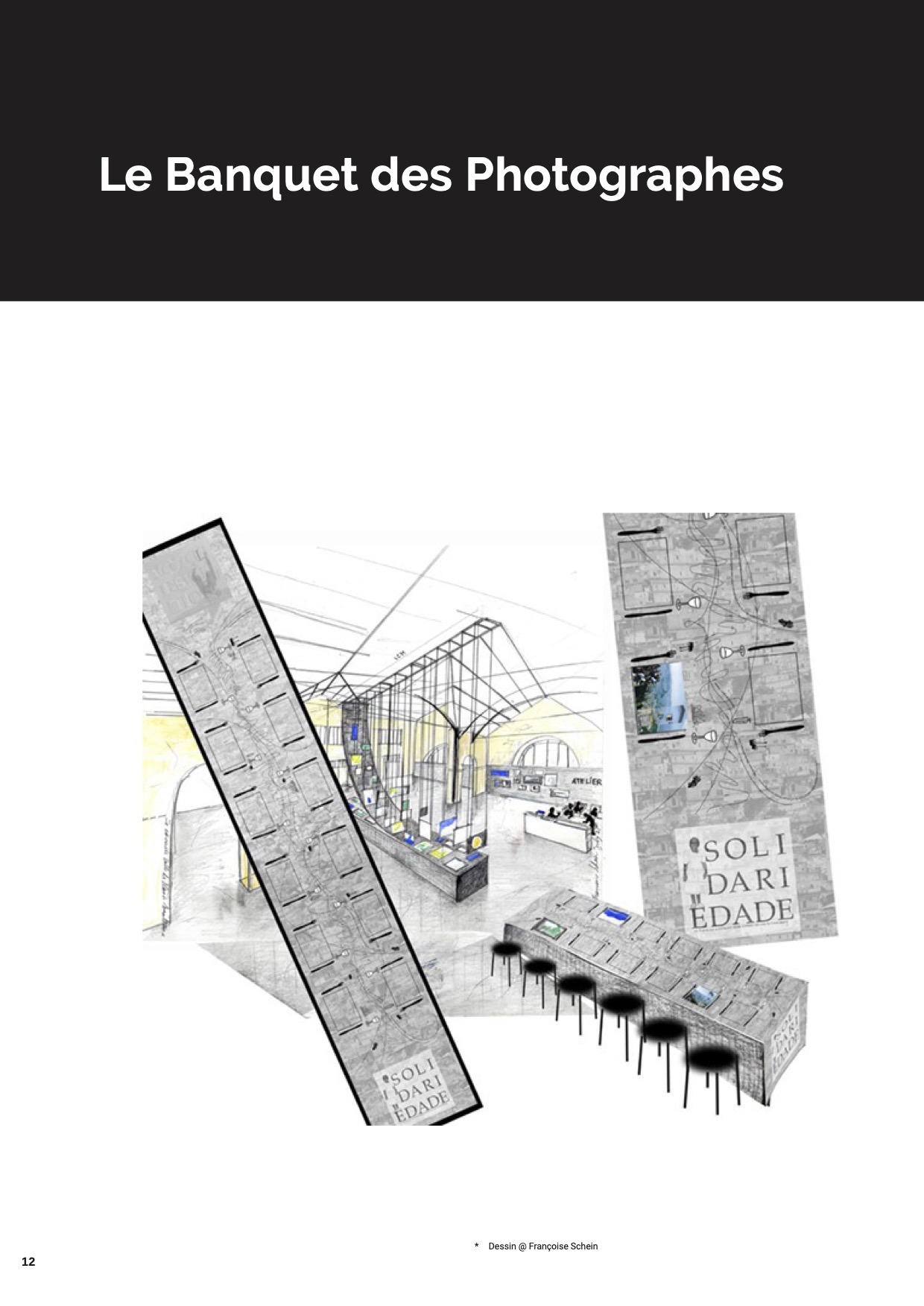 - Deux oeuvres monumentales collaboratives : Réalisée en partenariat avec l’association Inscrire, une installation monumentale d'après une oeuvre originale de Françoise Schein représentant une cascade, occupera l’axe central de l’espace, en écho à la construction de la société brésilienne. Dans sa prolongation immédiate, une seconde oeuvre intitulée Le Banquet des Photographes, sera l’occasion d’une performance sur les trois jours où les photographes sont invités à participer à un repas photographique et à déposer sur un dessin de table inédit et réalisé par Françoise Schein, une de leurs photographies dans une évocation au Brésil.